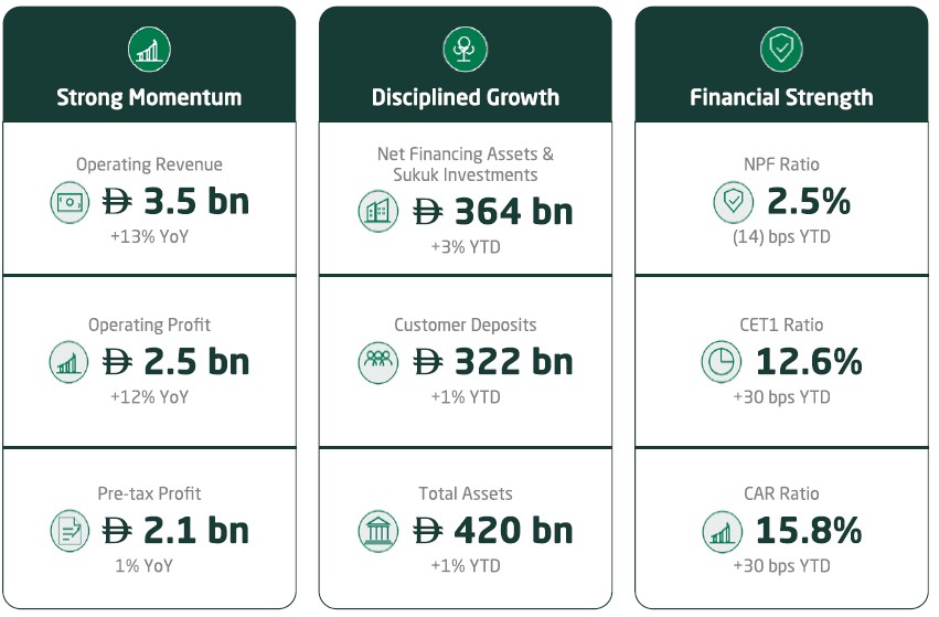 Balance sheet expansion remained healthy and well supported. Net financing assets and sukuk investments grew to AED 364 billion, supported by more than AED 24 billion in gross new financing and over AED 5 billion in gross new sukuk investments during the quarter. Customer deposits rose to AED 322 billion, reinforcing the depth of our funding base and providing solid support for continued business growth.