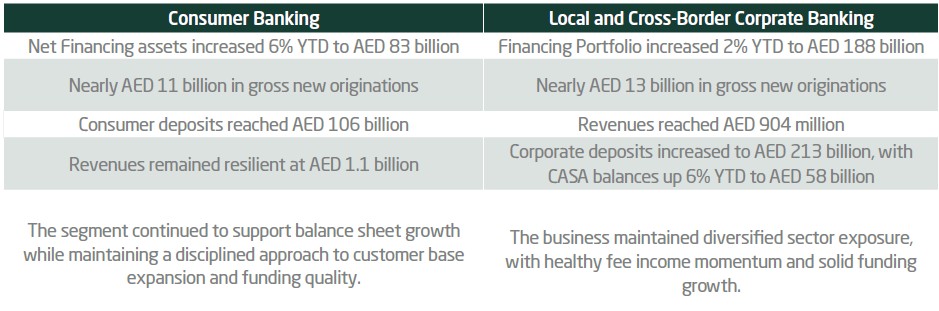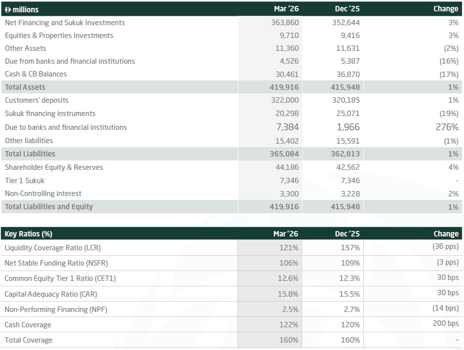 Balance sheet expansion remained healthy and well supported. Net financing assets and sukuk investments grew to AED 364 billion, supported by more than AED 24 billion in gross new financing and over AED 5 billion in gross new sukuk investments during the quarter. Customer deposits rose to AED 322 billion, reinforcing the depth of our funding base and providing solid support for continued business growth.
