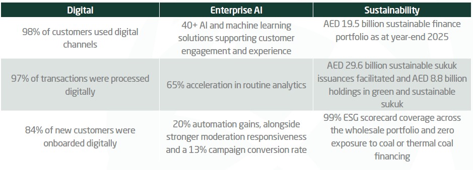 Alongside its financial performance, DIB continued to make progress across digital banking, enterprise AI and sustainability. The achievements below provide additional context on the Bank’s progress across key strategic priorities beyond the quarter’s core financial performance.
