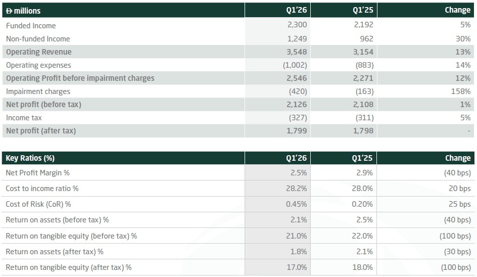 Our revenue profile continued to broaden during the quarter. Funded income increased by 5% year-on-year, while non-funded income grew by 30%, reflecting stronger contribution from across the business and a more balanced income mix overall. This helped drive operating profit to AED 2.5 billion, while pre-tax return on tangible equity remained strong at 21%, in line with our focus on quality growth and sustained profitability.